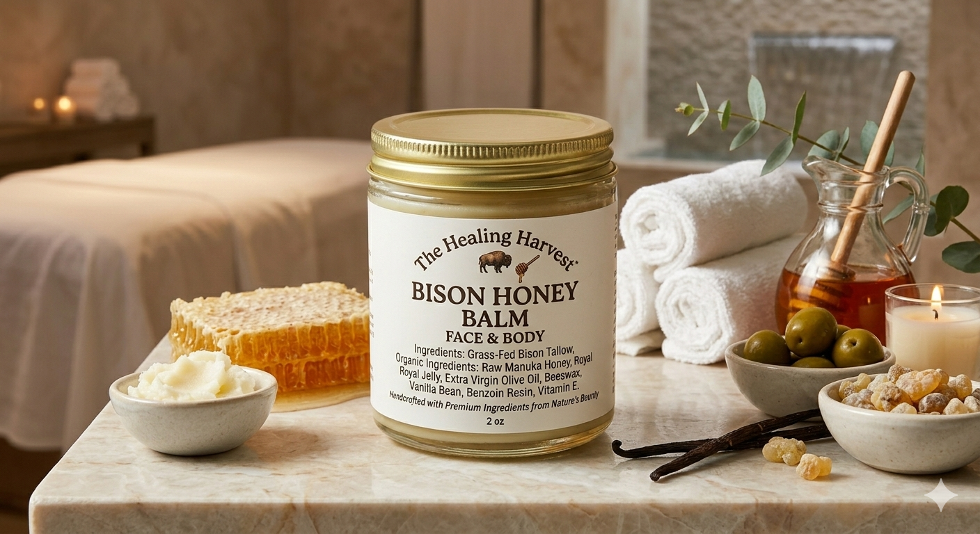 Indulge yourself in Natural Skincare with Bison Honey Balm. This luxurious blend of premium ingredients that harness the nourishing power of nature to provide your skin with ultimate moisure and a radiant glow. Ingredients as pictured. Benefits: Deep moisturization: Bison Tallow is rich in vitamins A, D, E, and K which deeply moisturize and rejuvenate your skin. Natural Healing: Manuka Honey, Royal Jelly and Frankincense are known for their antibacerial and soothing properties, helping to heal and protect your skin from everyday stressors. These ingredients pack a dense supply of amino acids, vitamins and bioactive compounds. Versatile Use. Perfect for use on dry patches, acme, a daily moisturizer, or a soothing balm for minor skin irratations. Bonus Uses: Rashes, cuts, scrapes, eczema, psoriasis, sundburn. How to Use: Apply a small amount to clean dry skin. Gently message in circular motion until fully absorbed. Use daily for best results.